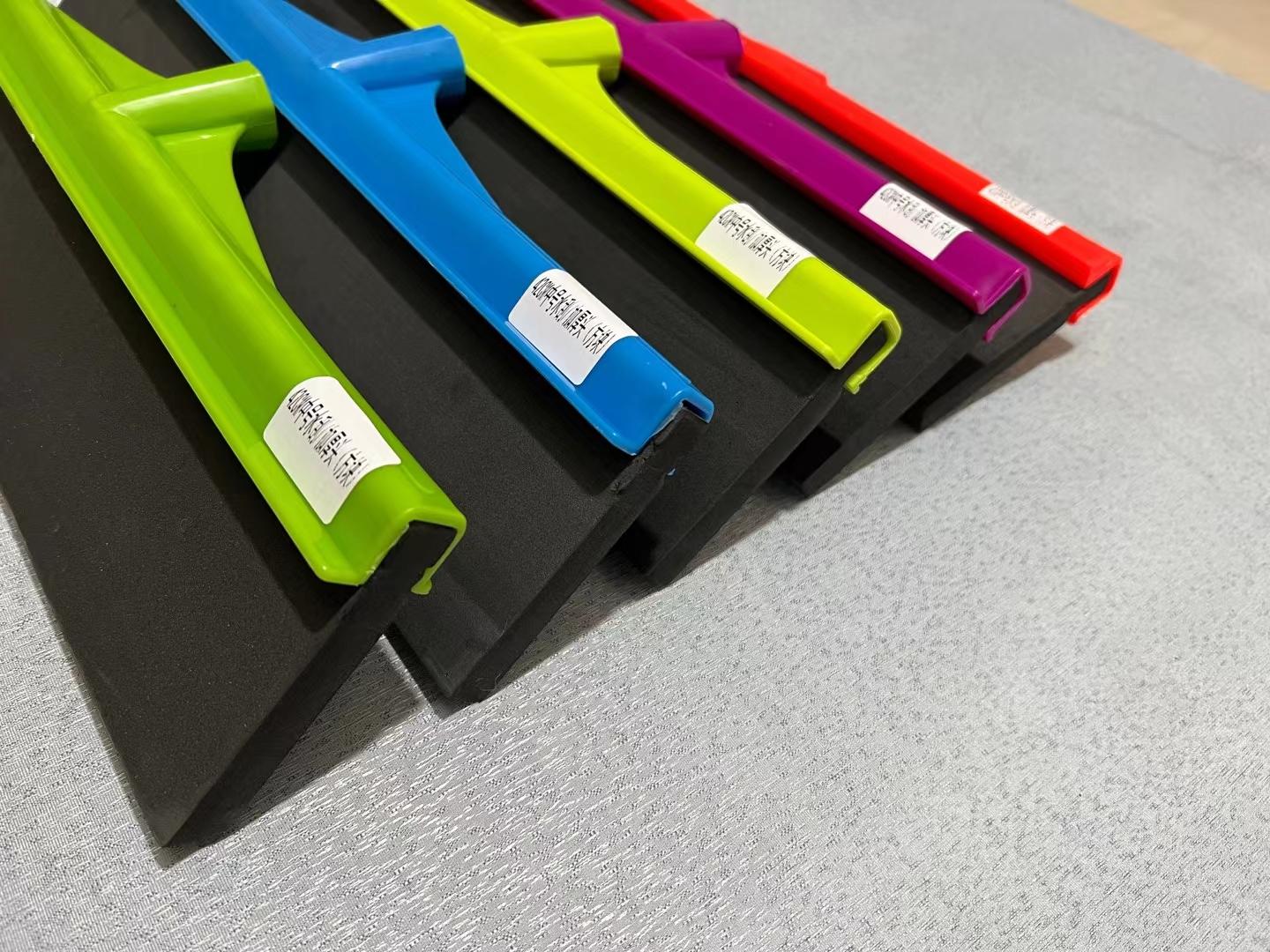 These are a series of colorful squeegees. They come in a variety of vibrant colors like green, blue, red, orange, and purple, making them visually appealing. The main body of each squeegee features a combination of a colored plastic handle and a black rubber blade. The rubber blade is designed to effectively wipe away liquids, such as water, from smooth surfaces like floors and windows. The handles are ergonomically shaped, providing a comfortable grip for easy and efficient use. These squeegees are suitable for household cleaning tasks, helping to keep surfaces dry and clean with convenience.