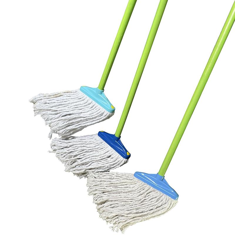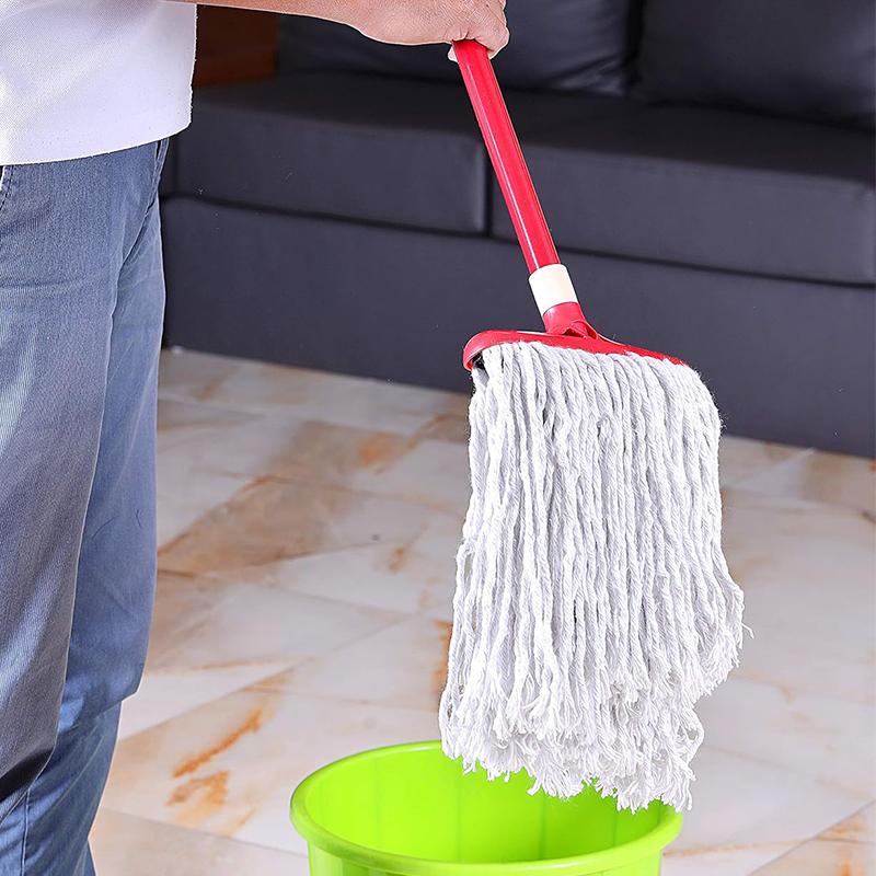 This cotton cord mop features a white cotton mop head and a red plastic connecting component. The cotton material has excellent water absorption and cleaning ability, effectively trapping dust and stains on the floor. The red part not only securely connects the mop head to the handle but also makes the overall appearance more eye-catching. It is suitable for cleaning hard floors in various places such as homes, offices, etc., and can easily meet daily cleaning needs.