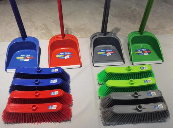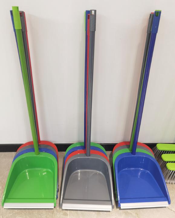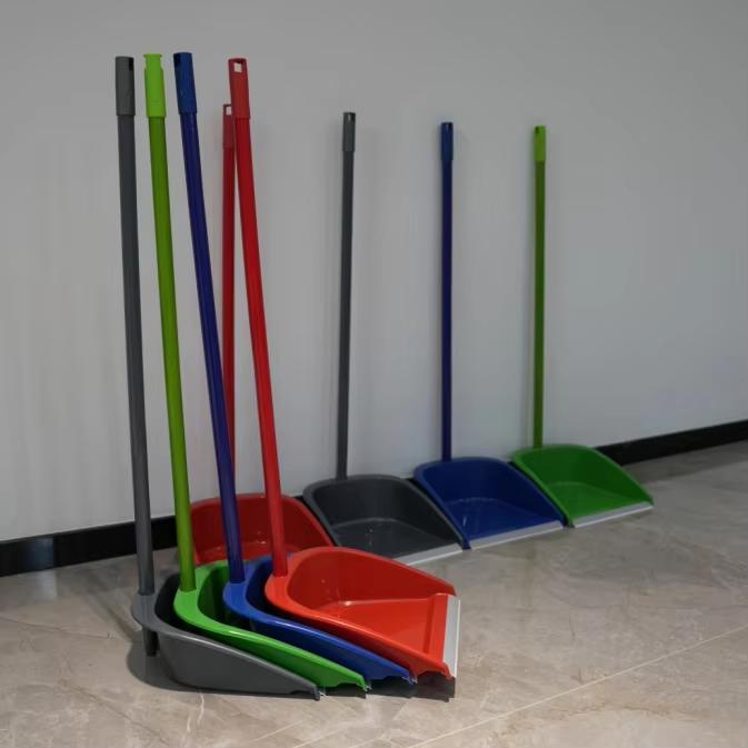 This is a colorful cleaning set of dustpans and brooms. The handles of the dustpans and brooms come in various colors such as red, blue, green, and gray, featuring a simple and practical design.