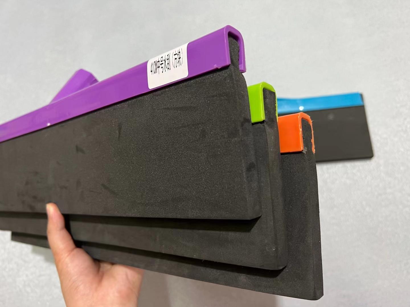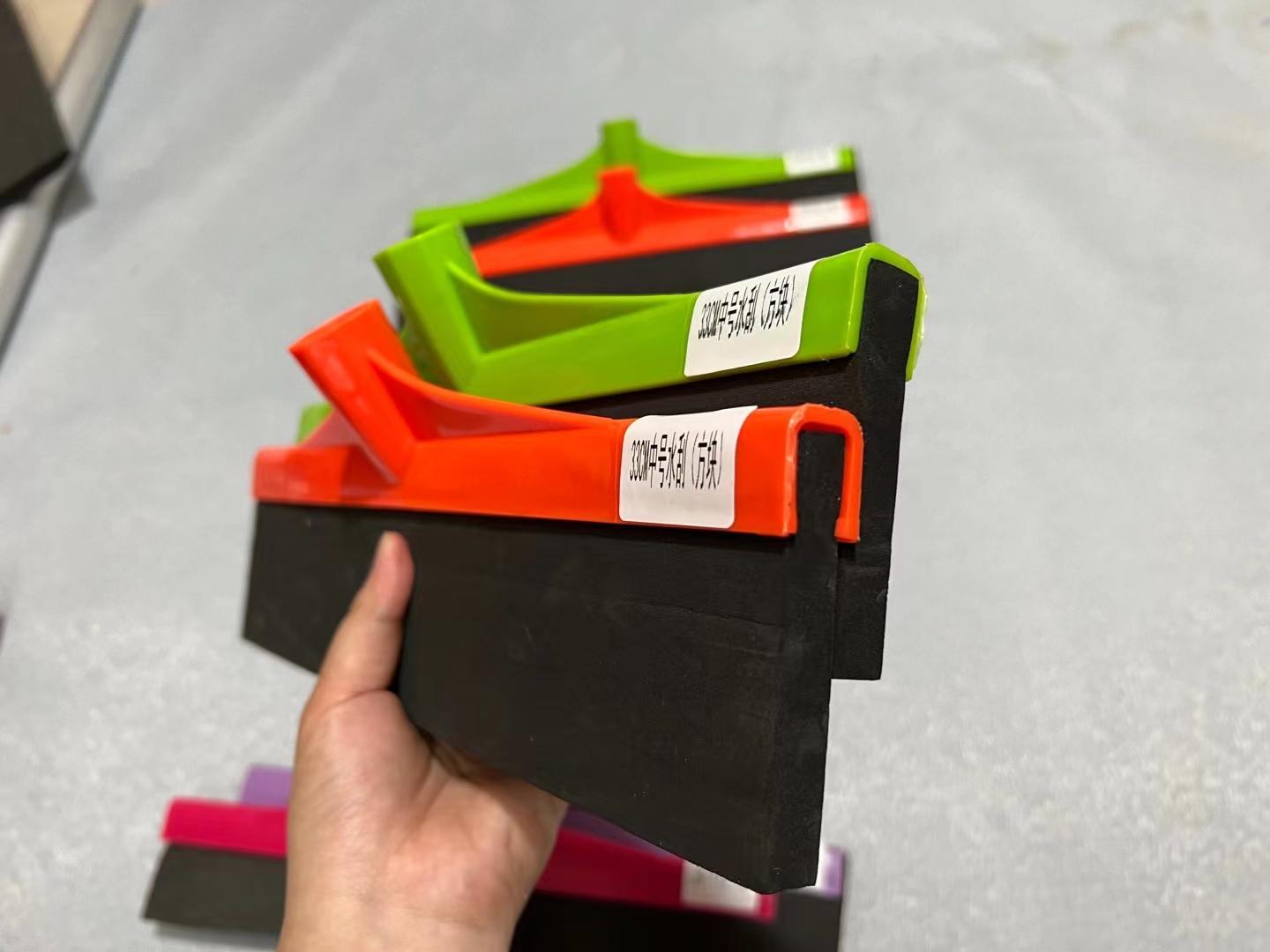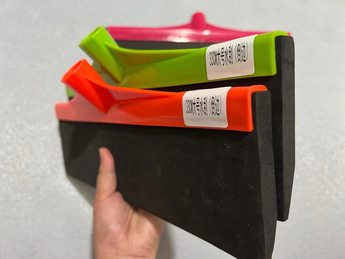 These are a series of colorful squeegees. They come in a variety of vibrant colors like green, blue, red, orange, and purple, making them visually appealing. The main body of each squeegee features a combination of a colored plastic handle and a black rubber blade. The rubber blade is designed to effectively wipe away liquids, such as water, from smooth surfaces like floors and windows. The handles are ergonomically shaped, providing a comfortable grip for easy and efficient use. These squeegees are suitable for household cleaning tasks, helping to keep surfaces dry and clean with convenience.